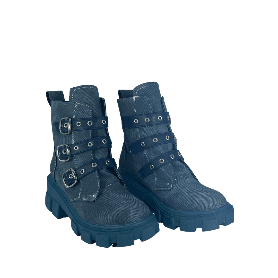 Botines que simulan el material mezclilla para mujer con detalles de hebillas en color azul que resaltan el diseño de los botines. Producto 100% construido artesanalmente en México. Difiere tu compra hasta 8 quincenas con Kueski Pay sin necesitar crédito y con el 0% de interés, ve a tu carrito de compra para más información !!! Envío gratis en todo México.