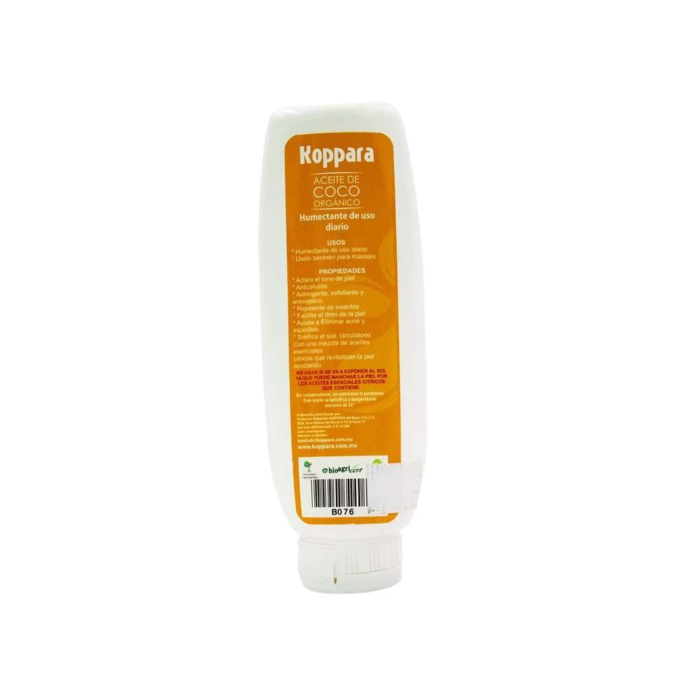 Koppara, Exquisita fórmula a base de aceite de coco orgánico con una mezcla de aceites esenciales cítricos que sirven para exfoliar la piel, aclararla, eliminar celulitis, manchas, arrugas, es nutritivo, antiséptico, astringente, tonificante y repelente de insectos.
